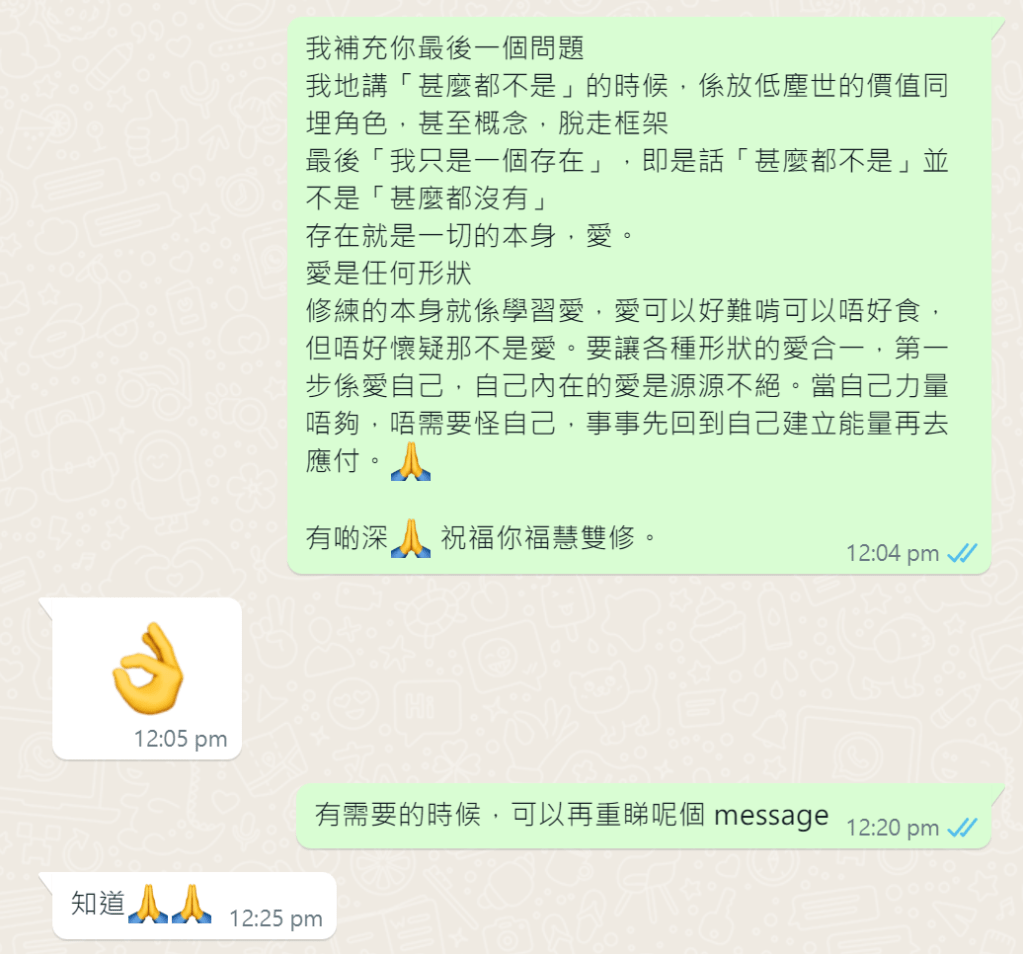 完成一課進階課。我更堅定相信,我開班只是與有緣的靈魂一起修煉,僅此而已。今天客人的最後一個問題是「到底有沒有愛?」她想,常常聽人說空又說甚麼都不是,那是甚麼都沒有嗎?