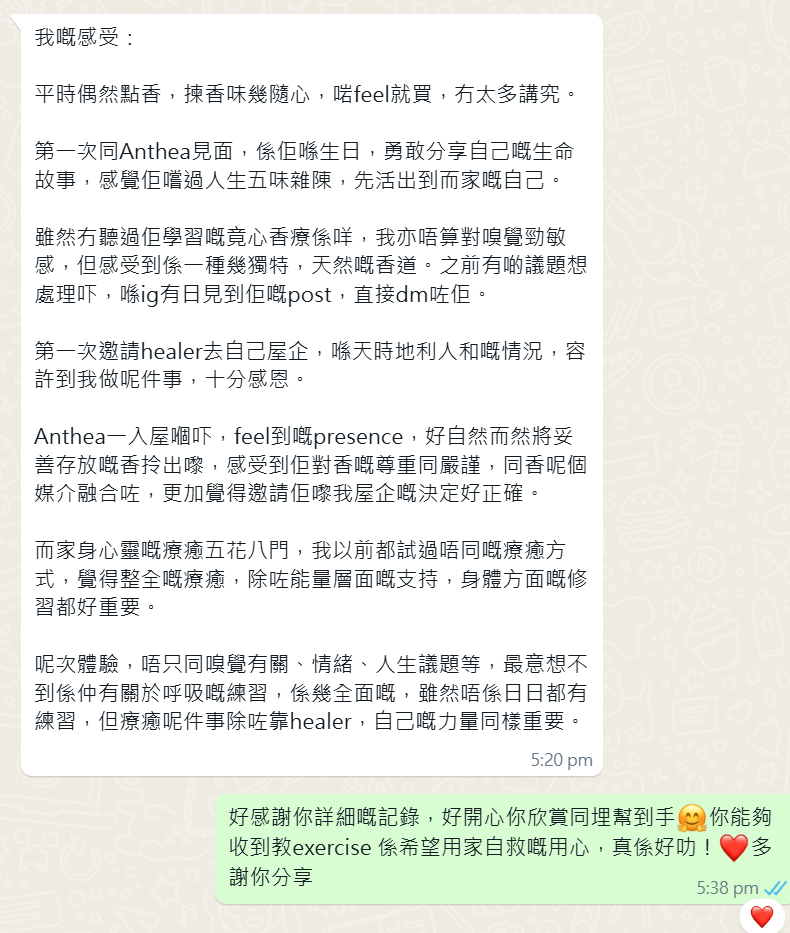 很多人不知道,療癒從來不是一件單向的事。我與張女士在一個修習的場合相遇。我一直都不會硬銷自己的課程,但我見她一直胃氣上湧,我覺得不是一個單純的微恙,於是我鼓起勇氣邀請她試試我的香療,她也鼓起勇起試我的香療。